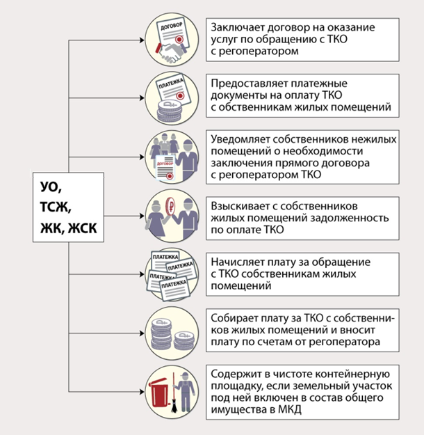 Сценарий № 1 «Договор управляющего с регоператором ТКО». По этому сценарию управляющая МКД организация полностью организует взаимодействие между потребителями и регоператором ТКО: заключает договор, начисляет плату, собирает долги. Функции УО, ТСЖ, ЖСК мы перечислили на рисунке 1.
