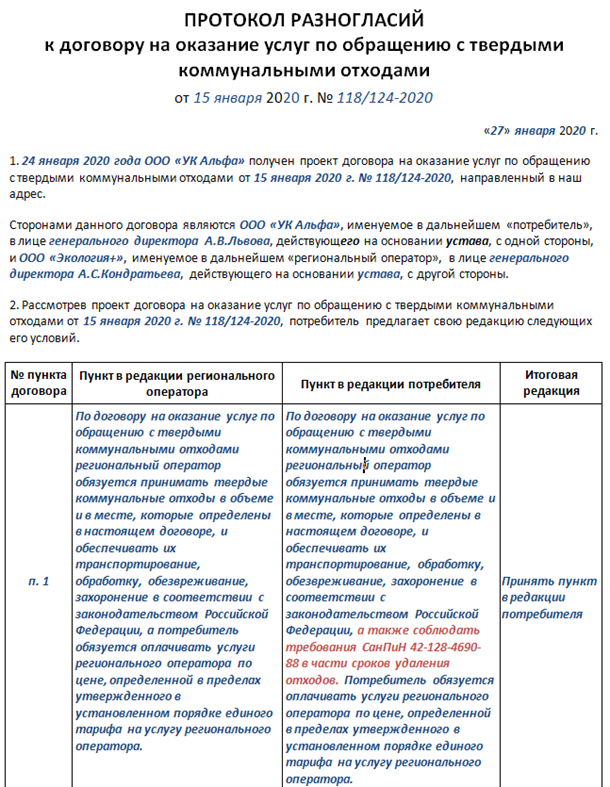 Рисунок 5. Пример протокола разногласий к договору на оказание услуг по обращению с ТКО