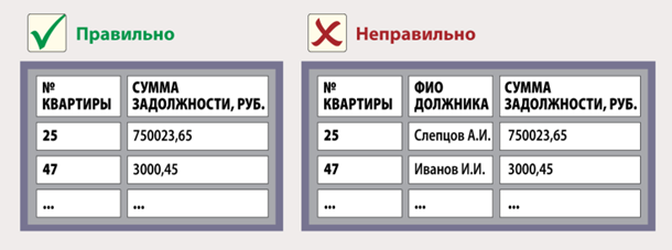 Обезличенными признают данные, по которым невозможно определить конкретного человека без использования дополнительной информации (п. 9 ст. 3 Закона от 27.07.2006 № 152-ФЗ «О персональных данных»). Поэтому УО, ТСЖ, ЖСК вправе размещать на досках объявлений списки должников, если указывают в них только номера квартир и суммы задолженностей. Примеры правильного и неправильного оформления списка должников смотрите на рисунке.