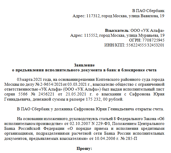 Рисунок 1. Образец заявления в банк о предъявлении исполнительного документа и блокировке счета должника