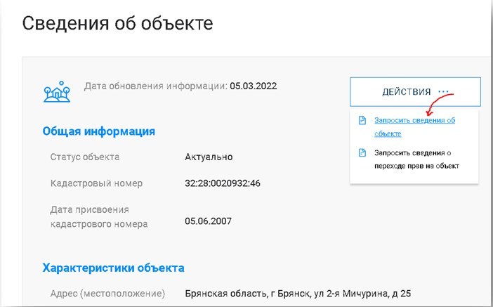 После нажатия на строку с результатом откроются «сведения об объекте», где справа сверху нужно нажать «запросить сведения об объекте».
