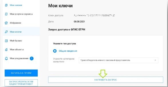 На той же странице для запроса доступа в ФГИС ЕГРН нажимаем кнопку «Направить запрос».