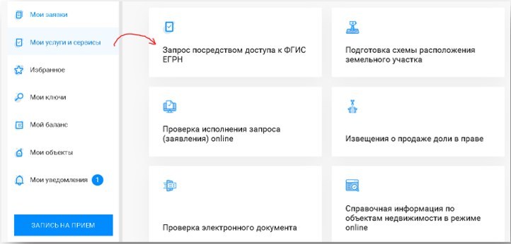 Для этого надо открыть вкладку «Мои услуги и сервисы». Пролистать вниз и выбрать «Запрос посредством доступа в ФГИС ЕГРН».