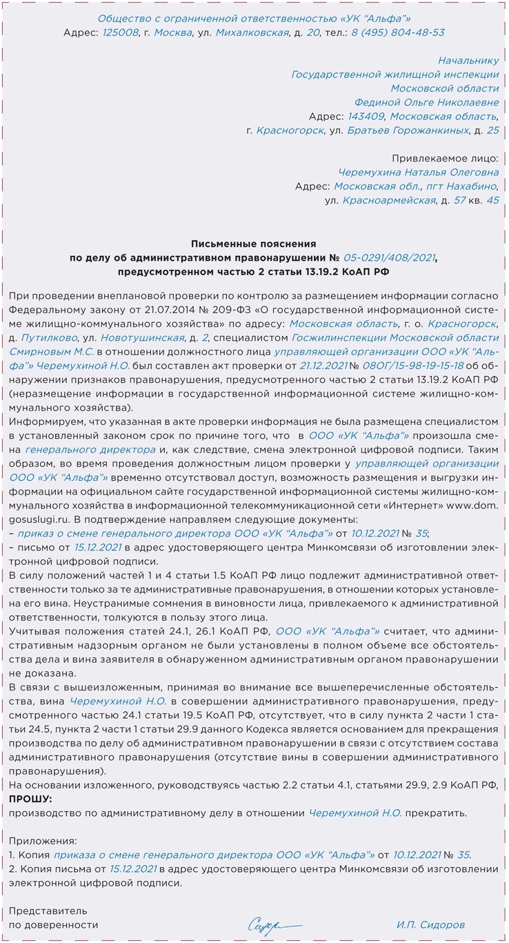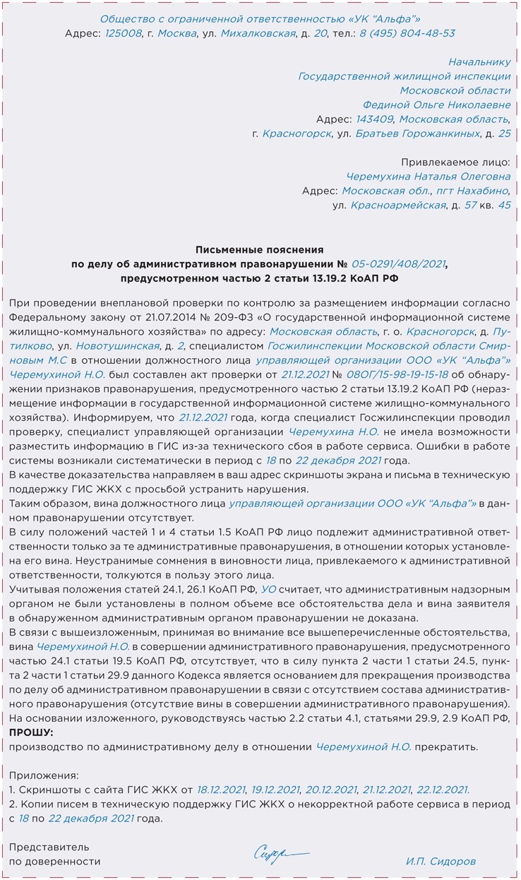 Рисунок 1 Письменные пояснения в ГЖИ о неразмещении информации в ГИС из-за технического сбоя, скачать пояснение