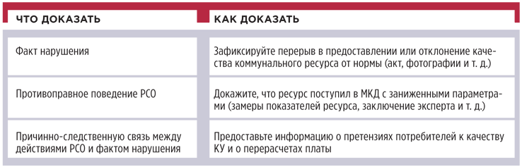 Чтобы взыскать убытки, докажите факт нарушения качества коммунального ресурса, противоправное поведение РСО и причинно-следственную связь между первым и вторым. Подробности смотрите в таблице.