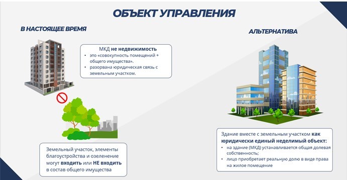 Правовой статус жилой недвижимости как объекта управления Нет четкости в нормативном закреплении правого режима многоквартирного дома (МКД) и других объектов жилой недвижимости (ОЖН), что ведет к неоднозначной трактовке понятий правоприменительными органами. Концепция единого объекта системно не проведена в ГК РФ и ЖК РФ, лишь фрагментарно. Отсюда происходит разрыв юридической судьбы земельного участка и здания на нем.