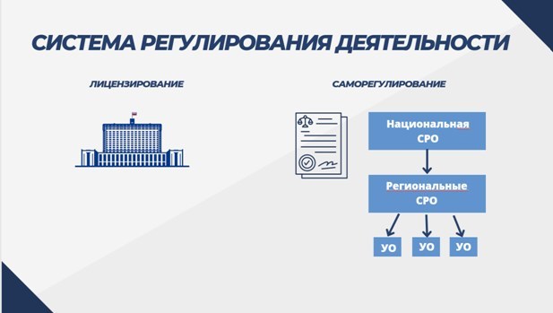 1. Переход к саморегулированию, как частно-правовому способу регулирования предпринимательской деятельности управляющих организаций. Членство в региональной СРО управляющих организаций – обязательное требование. В свою очередь, региональные СРО должны быть членами единой национальной СРО. 2. Целесообразно систематизировать и актуализировать обязательные требования к деятельности СРО, усилить ответственность СРО за соблюдением членами СРО установленных требований и стандартов. 3. В переходный период с лицензирования на саморегулирование необходимо пересмотреть систему мер ответственности за нарушения лицензионных требований, в том числе перечень грубых нарушений с учетом значимости нарушений.