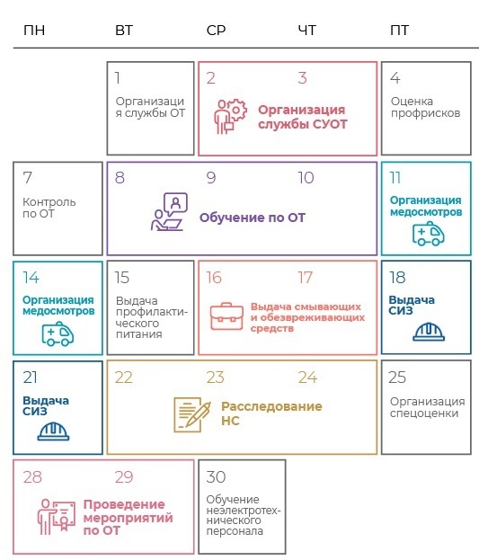 Чтобы проверить, все ли документы по охране труда есть в организации, выделите специальные дни. Для проверки всех документов за месяц, используйте график рабочих дней от Системы Охрана труда.