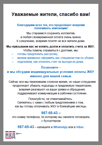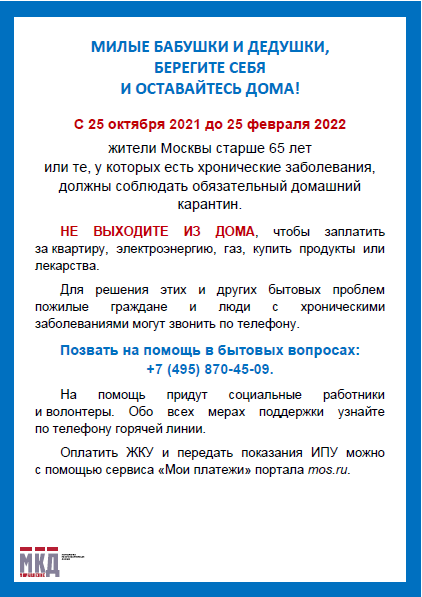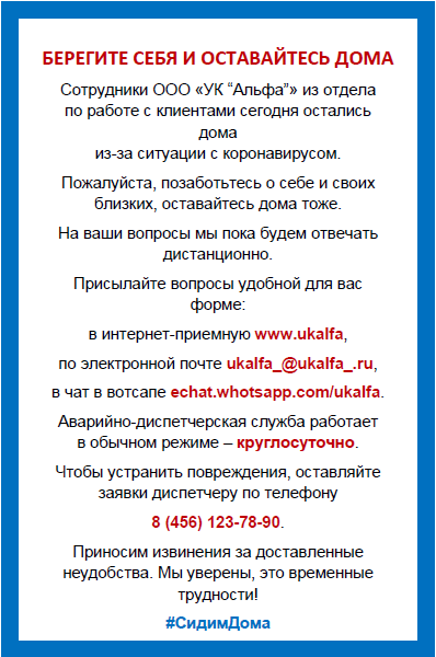 Саморегулируемая организация Добавьте плакаты, объявления о режиме работы УО в конце октября — начале ноября 2021 года. Поясните жителям, как будете вести прием в нерабочие дни, предложите соседям помогать пожилым людям в период самоизоляции.