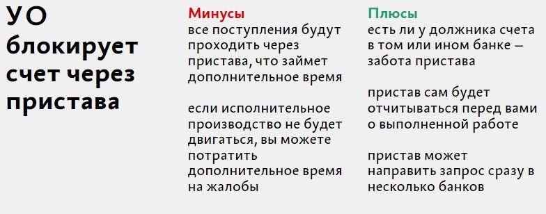 Таблица 1. Плюсы и минусы способов блокировки счетов должника