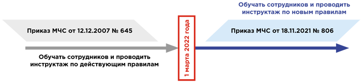 Порядок, виды, сроки обучения, требования к содержанию программ, по которым теперь проводят обучение, определили в приказе МЧС от 18.11.2021 № 806. До конца февраля 2022 года обучение проводят по старым правилам, которые установлены в приказе МЧС от 12.12.2007 № 645 (рисунок 1).