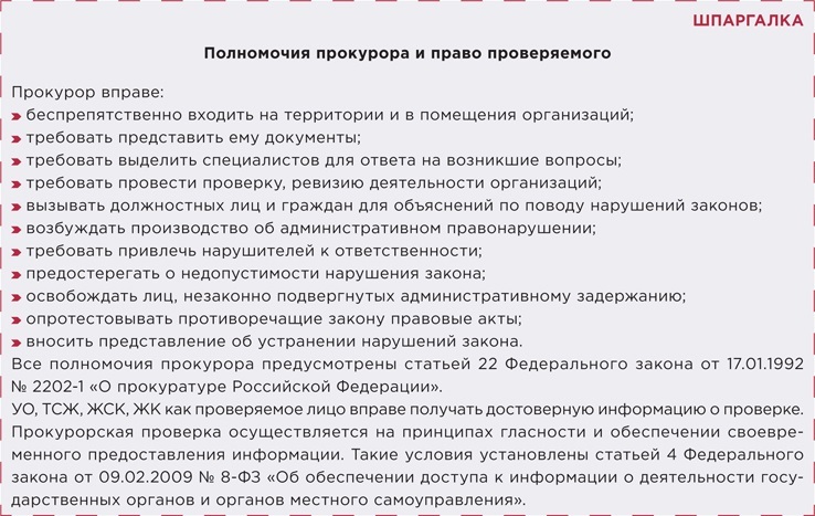 Саморегулируемая организация Мы сформулировали правила, по которым УО, ТСЖ и ЖСК будет проще пройти прокурорскую проверку. Узнайте кейсы, которые помогут в работе с прокурором, а также рекомендации практика, как отвечать на его запросы и законные требования. В статье — актуальная судебная практика, а также образцы жалоб и ответов прокурору.