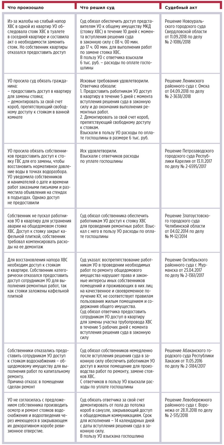 Когда собственник помещения отказывается предоставить доступ общедомовому имуществу для его ремонта, заказчик или исполнитель работ вправе добиваться доступа в судебном порядке. Если в такой ситуации будет причинен ущерб общему имуществу или имуществу других лиц из-за того, что управляющая МКД организация не смогла провести вовремя ремонт или аварийно-восстановительные работы, то до рассмотрения спора в суде вся ответственность ложится на собственника помещения.