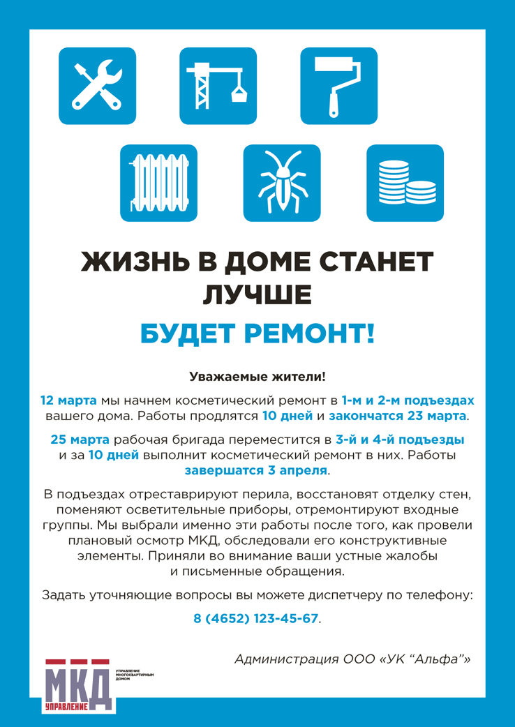 Саморегулируемая организация Чтобы жители охотнее платили за ЖКУ, нужно больше и понятнее рассказывать о том, какие работы в МКД вы делаете. Объявления о предстоящих работах — один из способов привлечь внимание и повысить лояльность. С должниками тоже старайтесь выстраивать доверительные отношения. Прежде чем угрожать пенями и отключениями, обсудите варианты погашения задолженности. Как можно оформить объявления и соглашения, смотрите ниже. Скачайте и используйте шаблоны в своей работе>>>