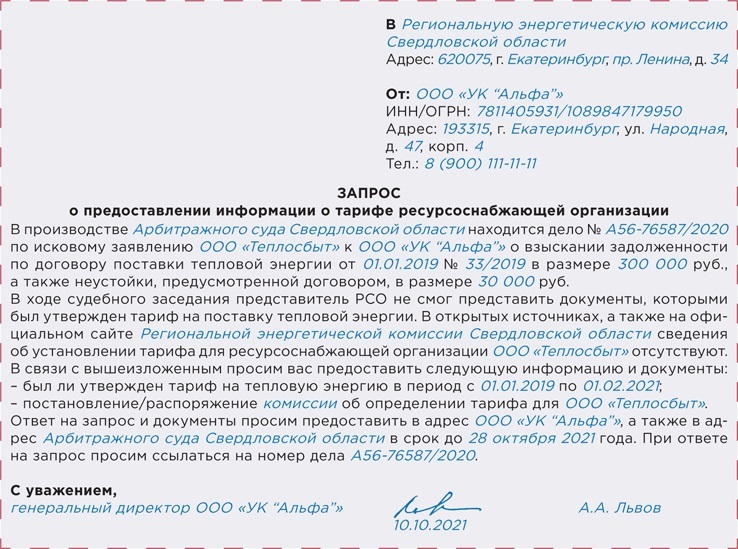 РИСУНОК 1 Образец запроса в РЭК о тарифе РСО