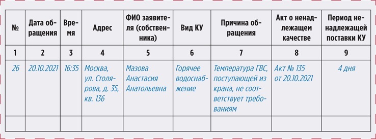 РИСУНОК 5 Пример оформления журнала регистрации фактов предоставления КУ ненадлежащего качества