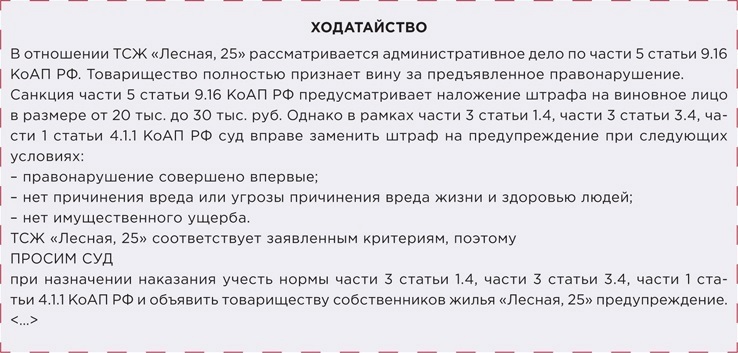 Кому и как перестроить работу: юристам ТСЖ, ЖК и ЖСК. Заявите ходатайство о замене штрафа на предупреждение, если жилищное объединение или его должностных лиц привлекли к ответственности по статьям 5.61.1, 6.4, 7.22, 7.23, 7.23.2, 8.1, части 1 статьи 9.1.1, частям 4, 5 статьи 9.16, частям 1, 5, 7–9 статьи 9.22, статьям 9.23, 13.11, части 2 статьи 14.5, части 1 статьи 4.6, статье 19.7 КоАП. Используйте шаблон, который мы показали на рисунке 1.