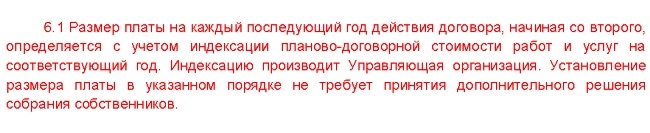 На самом деле условие об индексации противоречит пункту 2 статьи 310 ГК и суды признают его незаконным. Верховный суд разъяснил, что изменение фиксированного размера платы возможно исключительно на основании решения ОСС (п. 17 постановления Пленума Верховного суда от 27.06.2017 № 22, определение Верховного суда от 02.06.2017 № 306-КГ17-6867).
