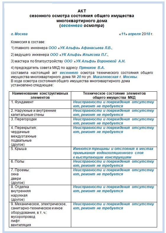 Акт осмотра составьте по общим правилам, пример заполнения акта смотрите на рисунке. В акте зафиксируйте техническое состояние общего имущества.