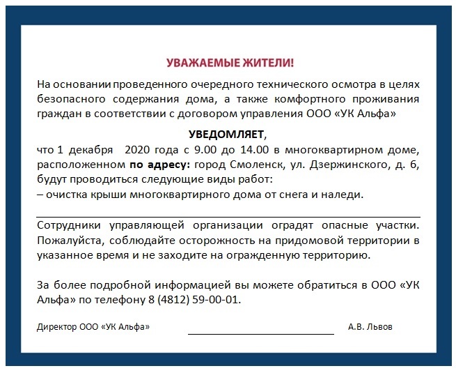 Чтобы предупредить жителей, воспользуйтесь шаблоном уведомления.