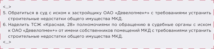 УО и ТСЖ могут предъявить иск к застройщику, только если их на это уполномочили собственники помещений. Дело в том, что права управленцев не ущемляются тем фактом, что застройщик допустил дефекты при строительстве. Поэтому суд начнет рассматривать ваши требования об устранении строительных недостатков только при наличии решения общего собрания собственников, в котором будут прописаны ваши полномочия (рисунок 1). Скачать фрагмент