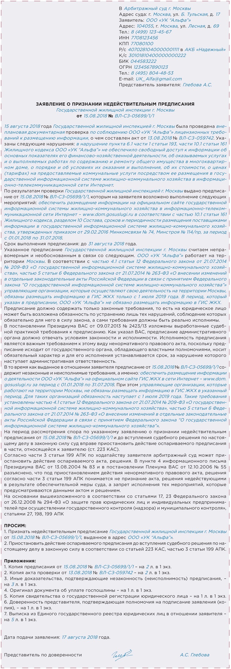 Саморегулируемая организация Вы можете отменить предписание ГЖИ в судебном порядке, если не согласны с ним полностью или в части. Для этого подайте в арбитражный суд заявление о признании недействительным предписания (рисунок). Скачать заявление
