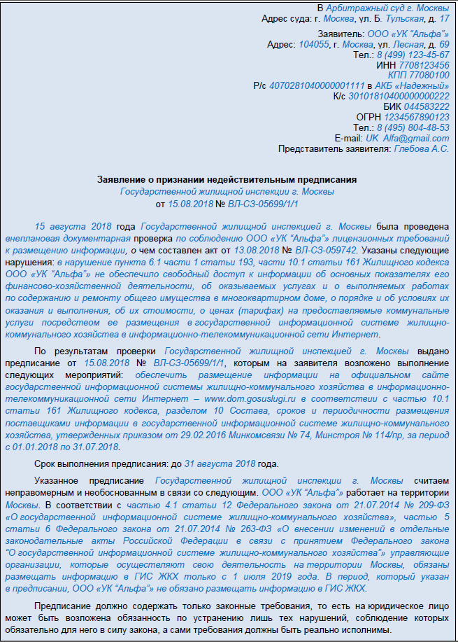 РИСУНОК 2 Заявление о признании недействительным предписания ГЖИ, скачать заявление