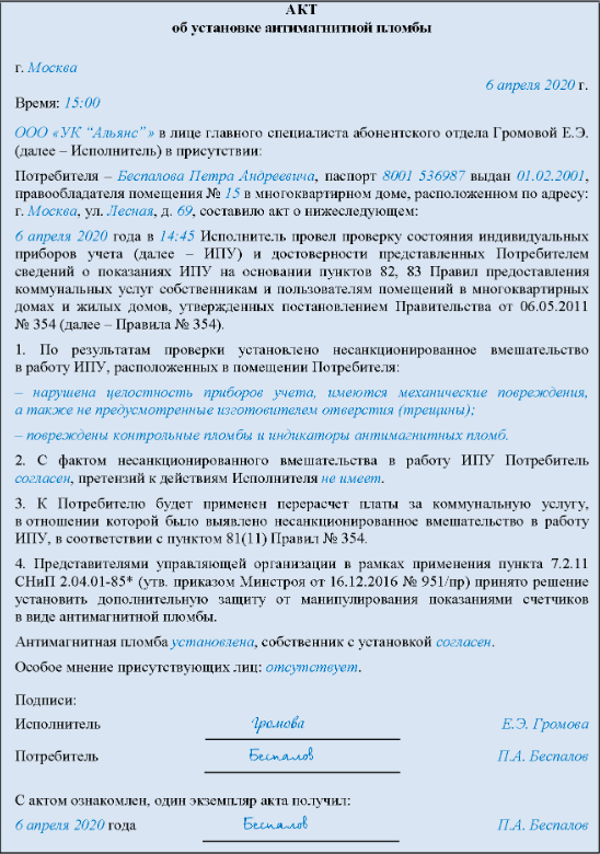 Потребитель обязан сохранять установленные на ИПУ магнитные пломбы (подп. «г(2)» п. 34 Правил № 354). В пункте 81(11) Правил № 354 перечислены показатели, нарушение которых признают несанкционированным вмешательством в работу прибора учета. Обнаружив такие нарушения при проверке, исполнитель составляет соответствующий акт. Если при этом доступ к ИПУ невозможен без присутствия потребителя, исполнитель делает перерасчет платы за КУ на основании норматива потребления. В рассмотренном случае ИПУ установлен на территории частного домовладения, доступ куда без хозяина — потребителя КУ невозможен.