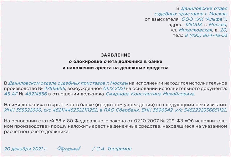 Чтобы предложить приставу взыскать задолженность через счета должника в банках, составьте заявление (рисунок). В обращении к приставу укажите на необходимость сделать запрос в мелкие и крупные банки или укажите сведения о счетах должника в банках, если они у вас есть. Скачать заявление здесь>>>