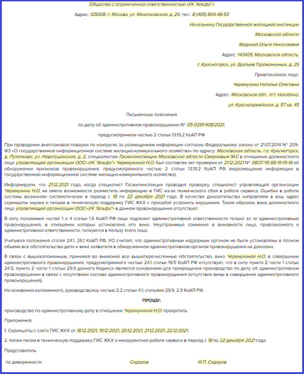 Пояснения в ГЖИ оформите на бланке организации и направьте их начальнику инспекции, где проводят проверку или выписали штраф. В названии письма укажите номер административного дела. По тексту опишите основание отсутствия вины за невозможность разместить информацию в ГИС ЖКХ. Распишите, когда вас оштрафовали, с чем связана невозможность разместить информацию и когда она возникла. Также укажите, что вы предприняли, чтобы разместить информацию