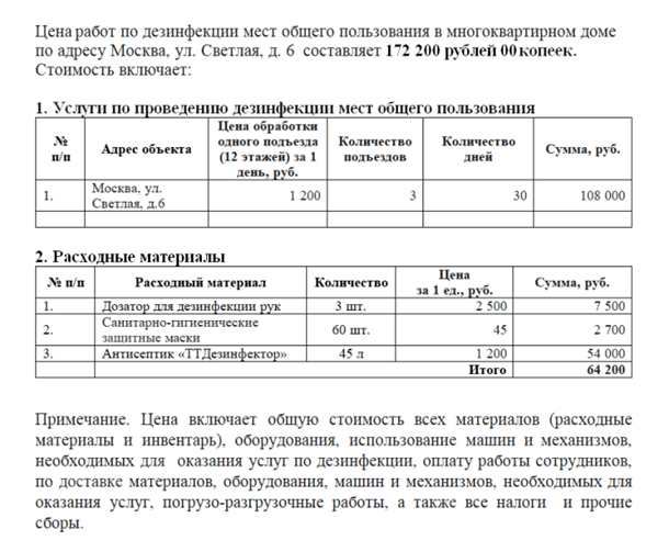 Рисунок 2. Пример сметы расходов на дезинфекцию подъездов и других мест общегопользования в МКД