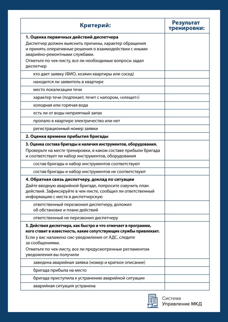 Для визуального контроля организуйте и проведите хронометраж времени приема звонков, принятия диспетчером решения. Также контролируйте сроки исполнения заявок, эффективность работы сотрудников при ликвидации аварий и неисправностей. Осматривайте применяемое оборудование, технику, средства связи.