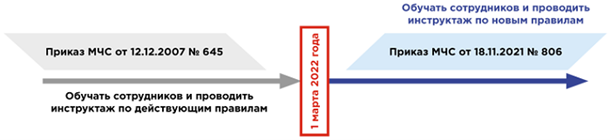 Порядок, виды, сроки обучения, требования к содержанию программ, по которым теперь проводят обучение, определили в приказе МЧС от 18.11.2021 № 806.