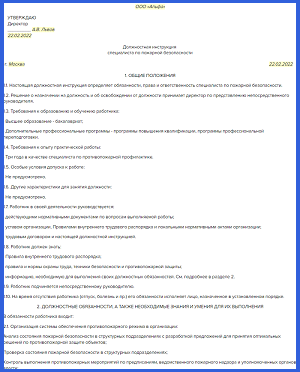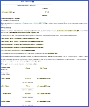 Ответственных лиц назначают приказом. Также отразите новые обязанности в должностных инструкциях работников, возьмите их из профстандарта «Специалист по пожарной профилактике» (приказ Минтруда от 11.10.2021 №696н). Эксперты системы разработали примеры документов, скачайте их, чтобы использовать в работе.