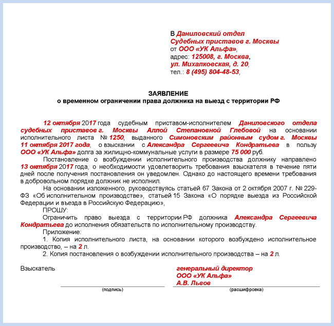 Если у вас есть судебное решение и исполнительный документ по долгу за ЖКУ, заявление о запрете на выезд подайте судебному приставу-исполнителю.