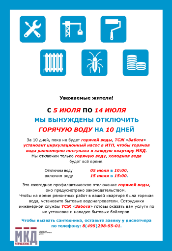 В объявлении укажите период перерыва и вид КУ, подачу которой собираетесь приостановить. На рисунках мы рассмотрели хорошие и не очень примеры оформления объявлений об отключении горячей воды.