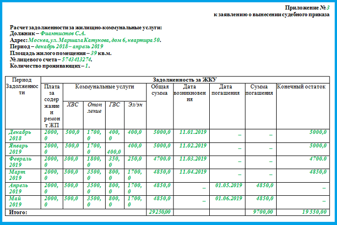 Запросите в бухгалтерии информацию по каждому должнику, на которого нужно подать заявление о вынесении судебного приказа в суд. Вам понадобятся четыре вида сведений: