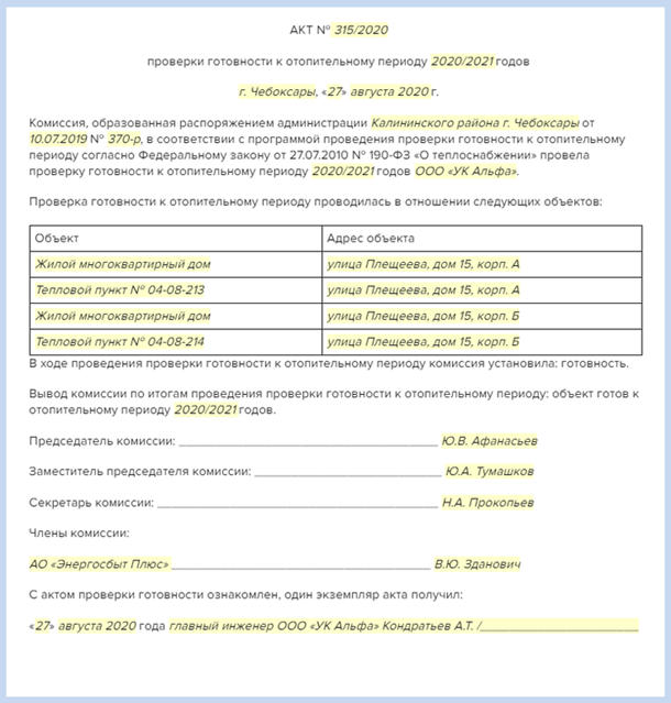Рисунок 4. Пример акта проверки готовности к отопительному периоду