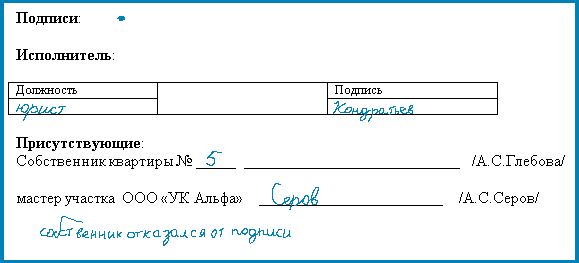 Акт подписывают участники: представители УО, ТСЖ, ЖСК и собственник помещения. К примеру, акт подпишут юрист УО по доверенности и собственник помещения. Если собственник отказывается подписать акт, сделайте об этом пометку.