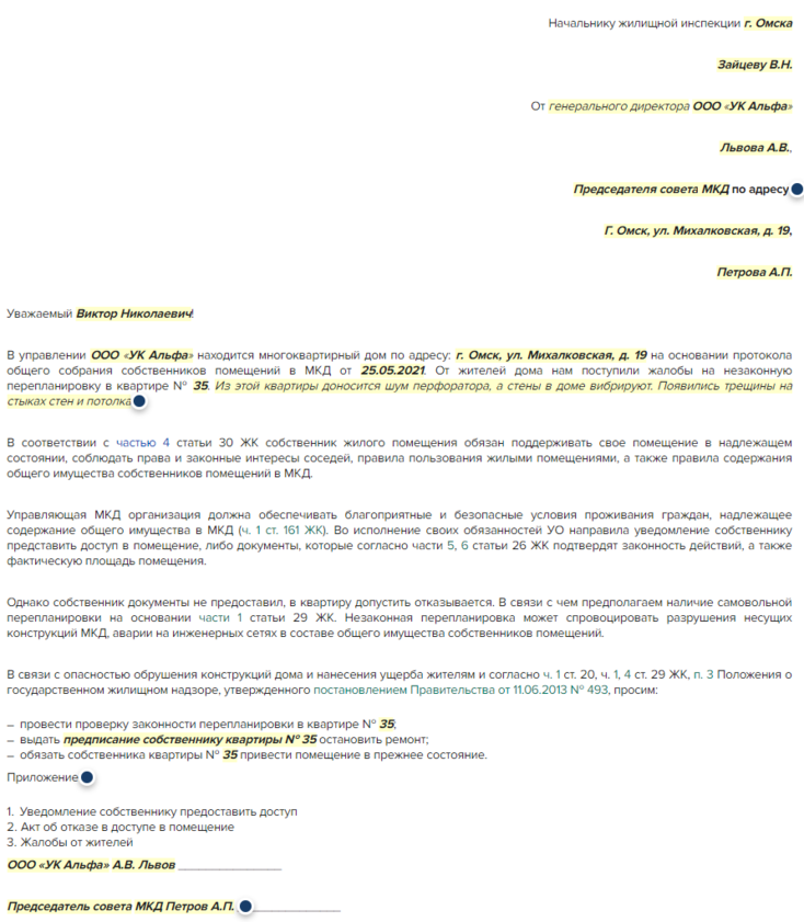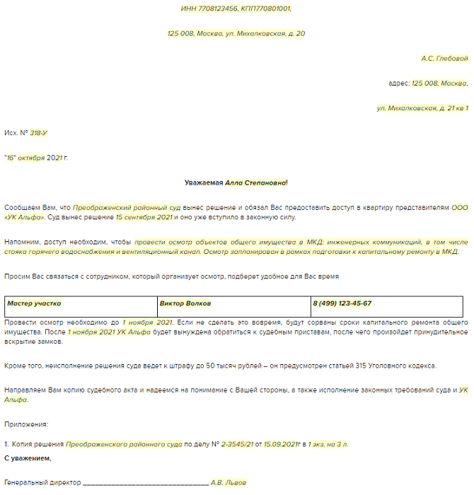 ПримерУО получила допуск в помещение через суд, чтобы проверить законность перепланировки УО направила требование предоставить доступ в жилое помещение, чтобы провести осмотр на вопрос законности перепланировки и переоборудования жилого помещения. Собственник впустил в помещение частично, но, так как этого было недостаточно, УО обратилась в суд. Житель не допускал в помещение, ссылаясь на то, что у УО нет оснований осматривать кухню и комнату, поскольку в указанных помещениях нет технического и санитарного внутриквартирного оборудования и аварийная ситуация в них не грозит. Также жалоб от других собственников УО в суде не предоставила. Судебная коллегия по гражданским делам Верховного суда удовлетворила требования УО и указала, что эксплуатационный контроль за техническим состоянием зданий и внутриквартирного оборудования УО должна проводить путем периодических осмотров. Для осмотров она вправе требовать допуска в заранее согласованное с потребителем время независимо от аварийной ситуации и жалоб жителей. Такой осмотр можно проводить не чаще одного раза в три месяца. Выводы содержит определение Верховного суда от 07.05.2019 № 4-КГ19-6. В отдельной рекомендации читайте, как получить доступ в помещение через суд при аварии. Как получить доступ, когда на руках есть решению судаКогда получите на руки судебный акт – направьте копию собственнику помещения. Это не обязательная процедура, но она поможет быстрее договориться. Подготовьте сопроводительное письмо и приложите к нему копию судебного акта. В письме укажите, с кем можно связаться, чтобы согласовать время доступа, и предупредите о последствиях неисполнения решения суда. Вот пример сопроводительного письма.