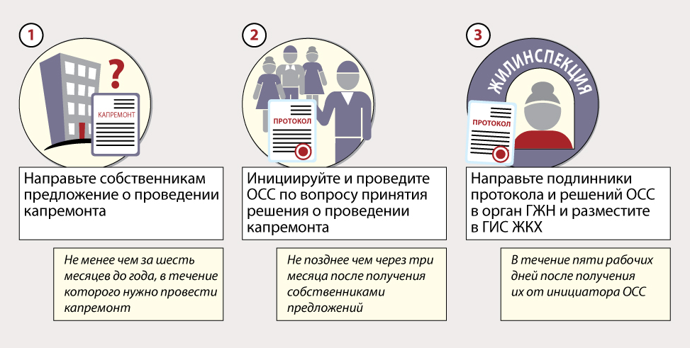 Не позднее чем через три месяца после получения собственниками предложений от управляющей МКД организации нужно провести общее собрание по вопросу принятия решения о проведении капитального ремонта в МКД (ч. 4 ст. 189 ЖК). Инициатором такого собрания может быть УО (ч. 4, 7 ст. 45 ЖК).