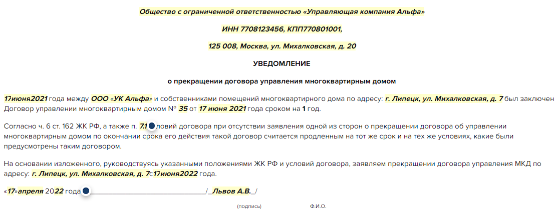 Судебных исков о расторжении (или о пролонгации) договора управления МКД стороны не подавали. Советом МКД подготовлено и направлено в УО "Комфорт" уведомление о том, что договор считается расторгнутым с 1 июля 2016 г..
