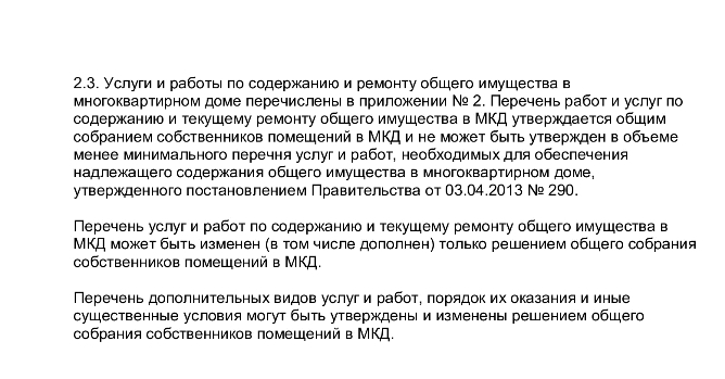 Минимальный перечень работ и услуг по содержанию общего имущества МКД закреплен постановлением Правительства от 03.04.2013 № 290 и пунктом 11 Правил № 491.