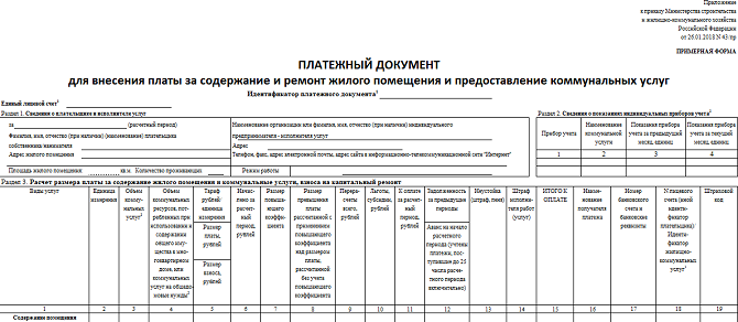 Примерная форма платежного документа для оплаты ЖКУ утверждена приказом Минстроя от 26.01.2018 № 43/пр. Утвержденная форма носит рекомендательный характер. Исполнитель ЖКУ в МКД (УО, ТСЖ, ЖК, ЖСК) вправе использовать ее, вносить в нее изменения и дополнения, а также разработать свою форму платежного документа.