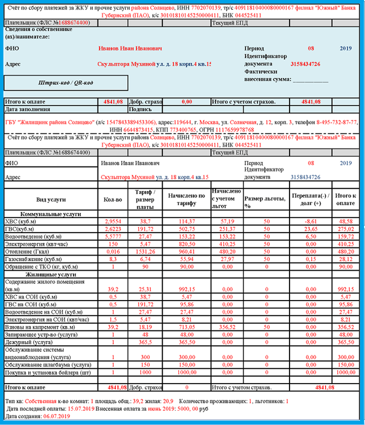 Рисунок 1. Примерная форма платежного документа за ЖКУ