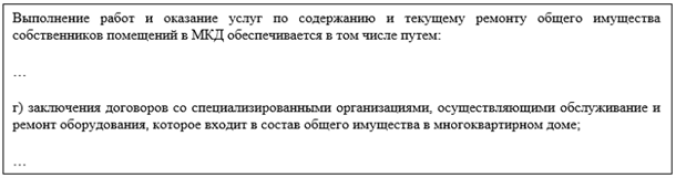 – условиями договора управления МКД, положениями устава ТСЖ, ЖСК изначально предусмотрена обязанность заключать договоры со специализированными организациями для обслуживания общего имущества в МКД – такая формулировка может быть оформлена общей фразой без конкретики на категории специализированных организаций.
