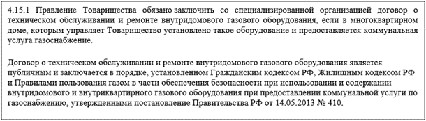 Аналогичные требования прописали для устава ТСЖ, ЖК, ЖСК – положениями должна быть предусмотрена обязанность жилищного объединения заключить со специализированной организацией договор о техническом обслуживании и ремонте ВДГО в МКД (ч. 1.2 ст. 113 ЖК, ч. 2.2 ст. 135 ЖК).