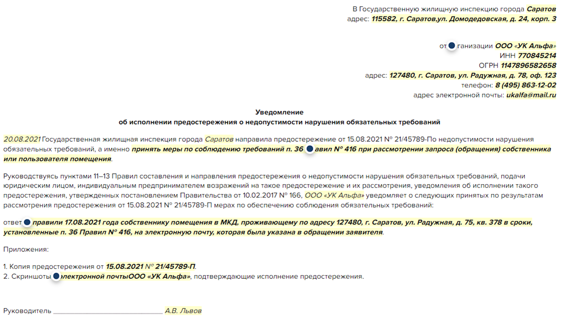 Если возражений нет, нужно исполнить предостережение и уведомить об этом ГЖИ. В уведомлении нужно указать наименование организации, ее ИНН, дату и номер предостережения и сведения о том, какие меры приняли, чтобы соблюсти закон. Весь перечень сведений установил пункт 12 Правил составления предостережений.
