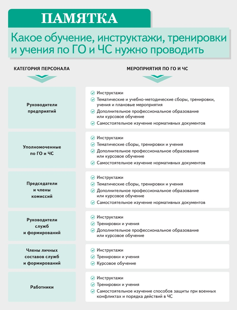Для работников всех предприятий должны проводить штабные и объектовые тренировки, а также противопожарные учения и тренировки. Если на предприятии есть аварийно-спасательные службы и формирования постоянной готовности, ее участникам дополнительно проводят тактико-специальные учения. Работники органов госвласти и госкорпораций также участвуют в командно-штабных учениях.