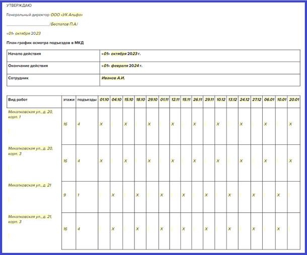 Перед вами примерный план-график осмотра подъездов в МКД. По этому графику обход проводит выделенный сотрудник, поэтому за один рабочий день он успевает обойти 2 МКД. В нашем примере 16-ти этажные дома, в каждом – по 4 подъезда.